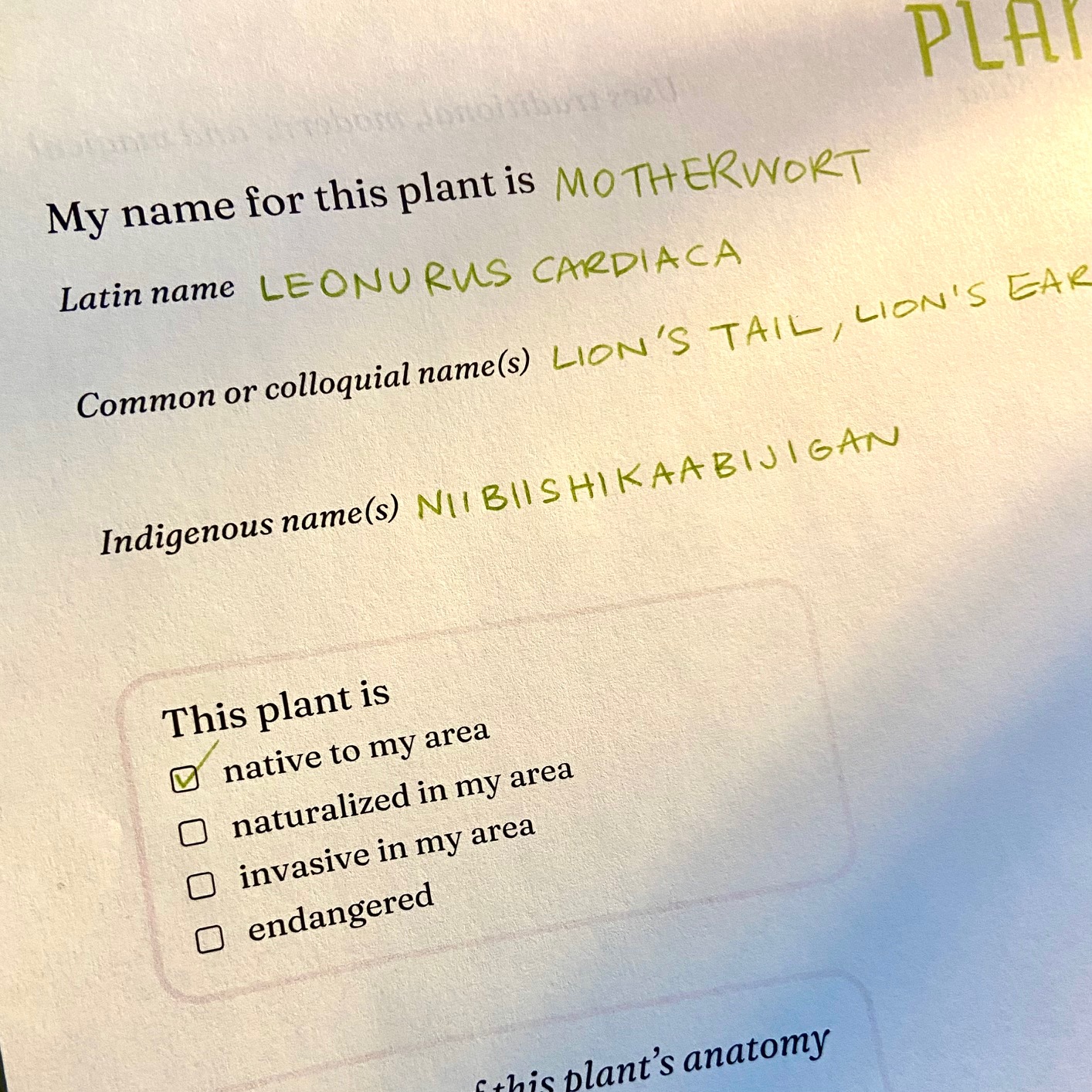 I hope that this worksheet is mostly self-explanatory, but I should probably point out that the empty space on the first page is for a drawing or photo of the plant you’re working with.