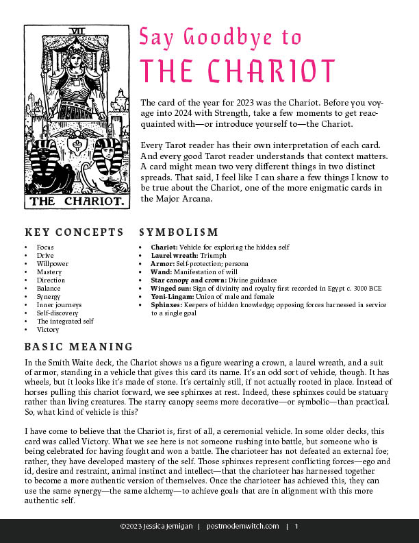 If you’d still like some guidance for rolling into 2024 like the force of nature that you are, I offered some snippets of insight in my last post. If you’d like to know more about my take on the card of the year, you should know that I am putting the finishing touches on A Postmodern Witch’s Guide to Strength. This is a digital download that is currently listed as a preorder in my shop. If you order now, you’ll get a teeny, tiny discount and a worksheet for reviewing 2023, the year of the Chariot.